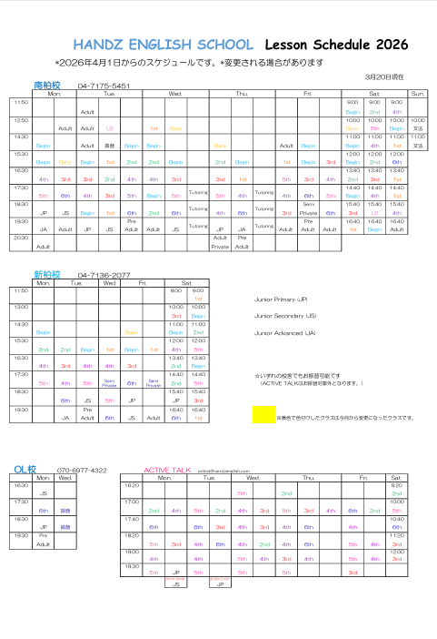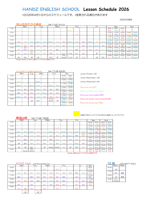 25 3月 【全校】レッスンスケジュール(2026年4月) 在校生へのお知らせ Leave a comment 4月レッスンスケジュールは以下の通りです。 ご質問は各校舎にお問い合わせください。 在校生へのお知らせ一覧に戻る トップへ戻る