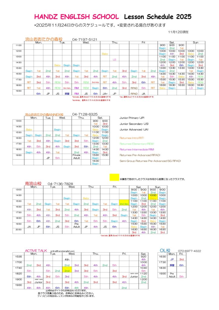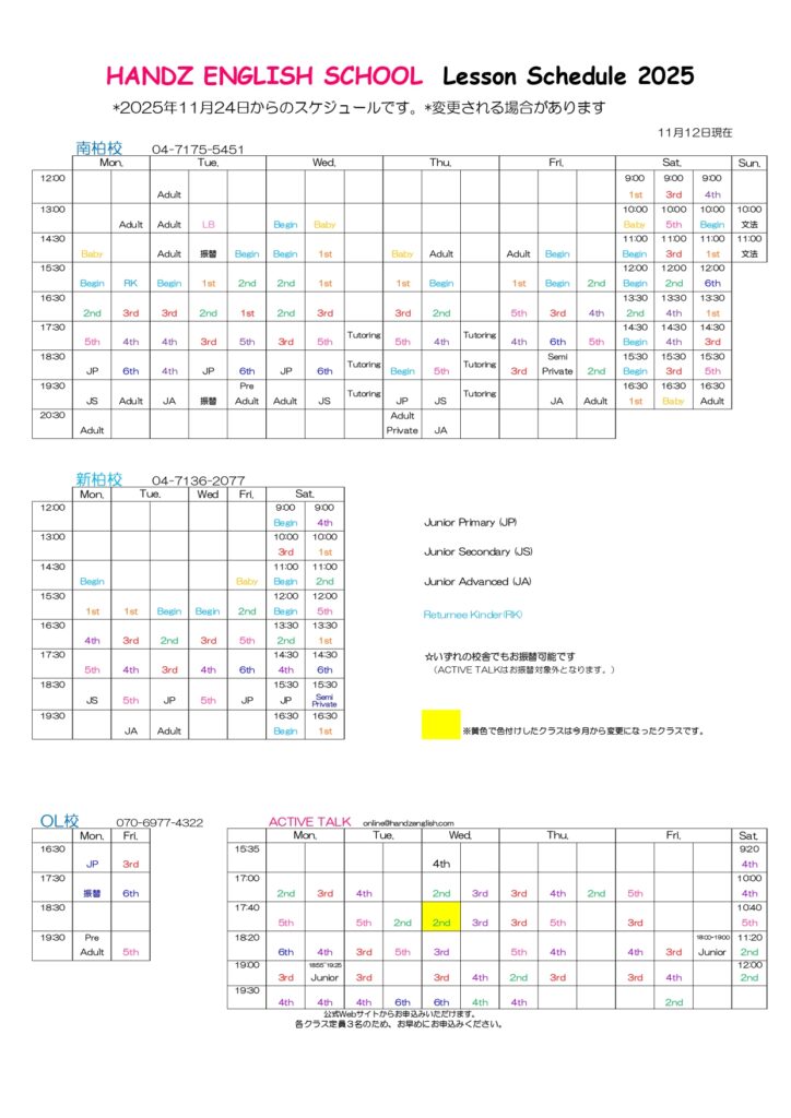18 11月 【全校】レッスンスケジュール(2025年12月) 在校生へのお知らせ Leave a comment 12月レッスンスケジュールは以下の通りです。 ご質問は各校舎にお問い合わせください。 在校生へのお知らせ一覧に戻る トップへ戻る