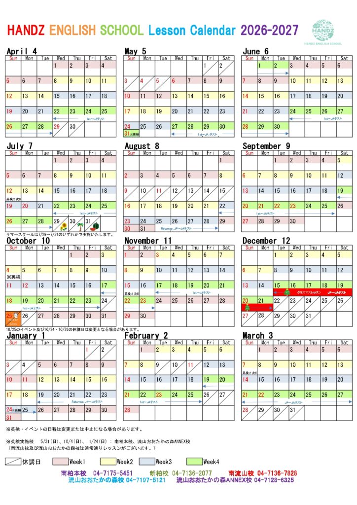 2026年度 スクールカレンダー
