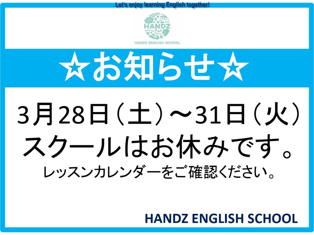 21 3月 休校日のお知らせ 2026年3月28日(土)~3月31日(火) 在校生へのお知らせ, 新着情報 Leave a comment 2026年3月28日(土)~3月31日(火)は休校のため、通常レッスンはございません。 体験レッスンのお申込みやお問い合わせへの対応は、通常よりお時間いただく場合がございます。 ご了承ください。 在校生へのお知らせ一覧に戻る トップへ戻る