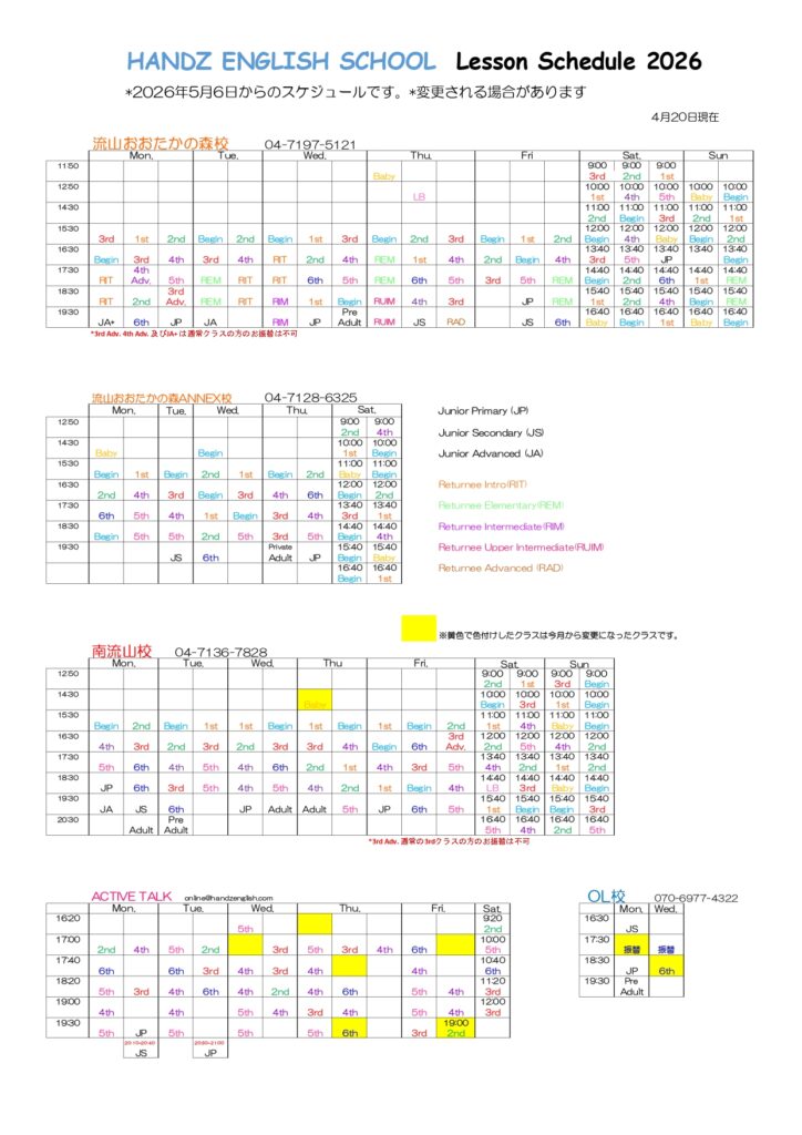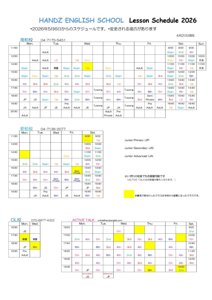5月レッスンスケジュールは以下の通りです。