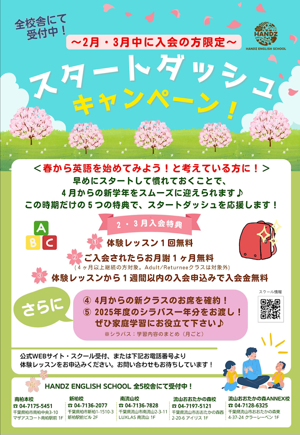 17 2月 スタートダッシュキャンペーン実施中! 新着情報, 在校生へのお知らせ Leave a comment 新しいスタートを応援するスタートダッシュキャンペーン実施いたします。 2月・3月にご入会の方限定で、 英会話学習を始めやすい特典をご用意しました。 新学期・新生活に向けて、今から英語に慣れておくことで、4月以降もスムーズにレッスンをスタートできます。 英会話が初めての方も、久しぶりの方も大歓迎です。 この機会に、ぜひ英語学習を始めてみませんか?